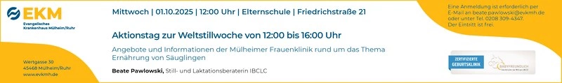 Mittwoch | 01.10.2025 | 12:00 Uhr | Elternschule | Friedrichstraße 21 Aktionstag zur Weltstillwoche von 12:00 bis 16:00 Uhr Wertgasse 30 45468 Mülheim/Ruhr www.evkmh.de Angebote und Informationen der Mülheimer Frauenklinik rund um das Thema Ernährung